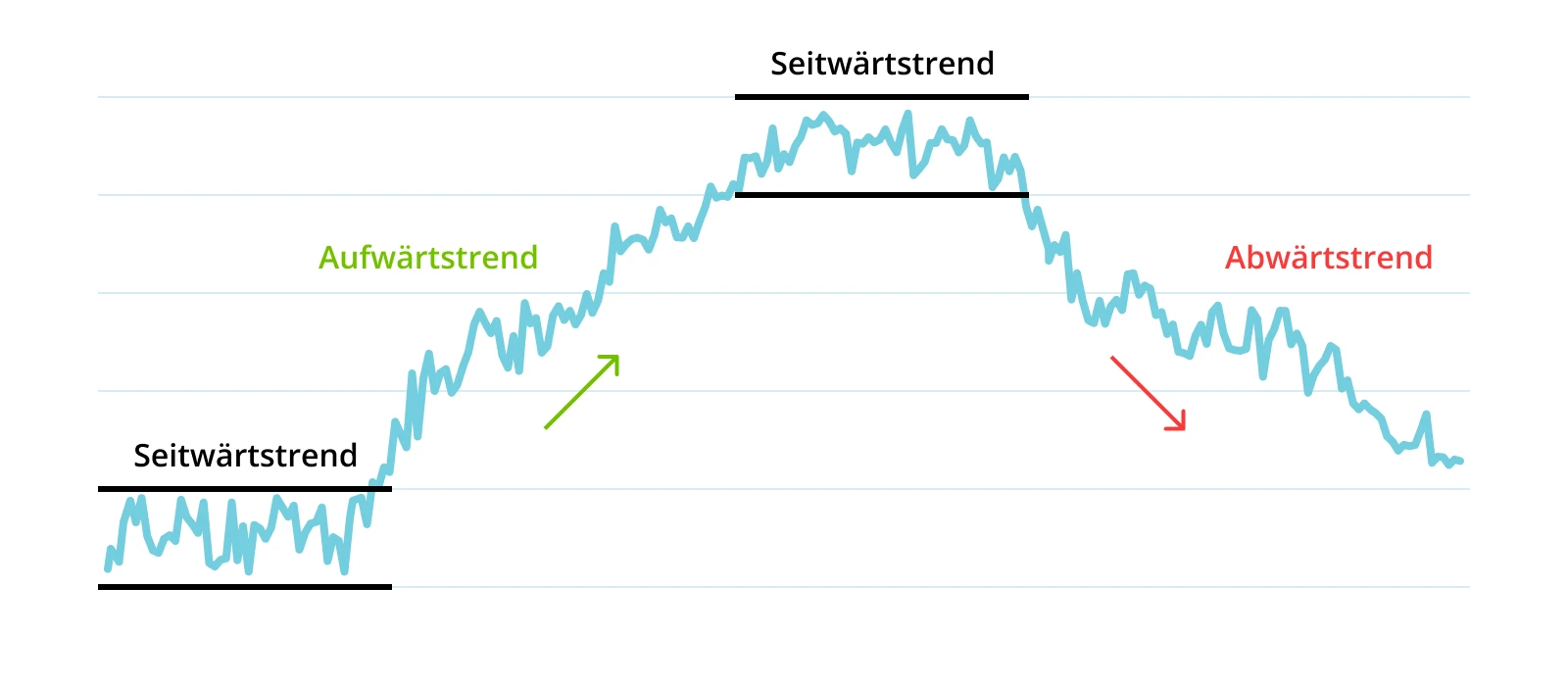 Ein Aufwärtstrend wird als eine Serie von aufsteigenden Gipfeln und Tälern definiert. Ein Abwärtstrend hingegen als eine Serie niedriger Gipfel und Täler, sprich dem genauen Gegenteil. Gleich hohe Gipfel und Täler implizieren einen Seitwärtstrend. Obwohl ein richtungsloses Asset oder ein richtungsloser Markt als Seitwärtstrend angesehen wird, wird auch häufig der Begriff „trendlos“ verwendet.