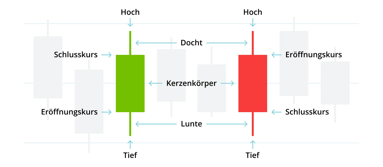 Kerzencharts sind dabei die japanische Version des Balkencharts und sind in den letzten Jahren bei westlichen Chartanalysen sehr populär geworden. Die Kerze zeichnet vier Kurse – den Eröffnungskurs, den Tageshoch- und -tiefkurs als sowohl den Schlusskurs – auf. Die dünne Linie (Docht und Lunte) zeigen die tägliche Schwankungsbreite vom Hoch- zum Tiefkurs. Dabei ist der Docht die höhere dünne Linie über den Kerzenkörper und die untere dünne Linie unter dem Kerzenkörper die Lunte. Der breite Teil (Kerzenkörper) misst den Abstand zwischen Eröffnungs- und Schlusskurs. Ist der Schlusskurs höher als der Eröffnungskurs, ist der Kerzenkörper grün oder weiß (positiv), ist er niedriger ist die Farbe des Körpers rot oder schwarz (negativ). Das Schlüsselelement des Kerzencharts ist dabei die Bezeichnung zwischen Eröffnungs- und Schlusskurs. Grundsätzlich können Kerzencharts nicht nur auf Tagesbasis abgebildet werden, sondern sowohl von minütlicher bis hin zur monatlichen Betrachtung angepasst werden. Hierbei sind dem Intervall keine Grenzen gesetzt.