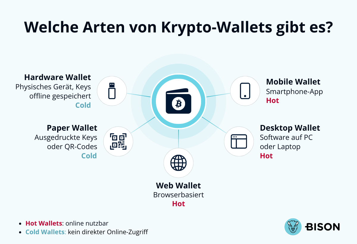 * Hot Wallets werden in einer onlinefähigen Umgebung genutzt, die eine Internetverbindung erlaubt. Cold Wallets bieten keinen direkten Online-Zugriff.